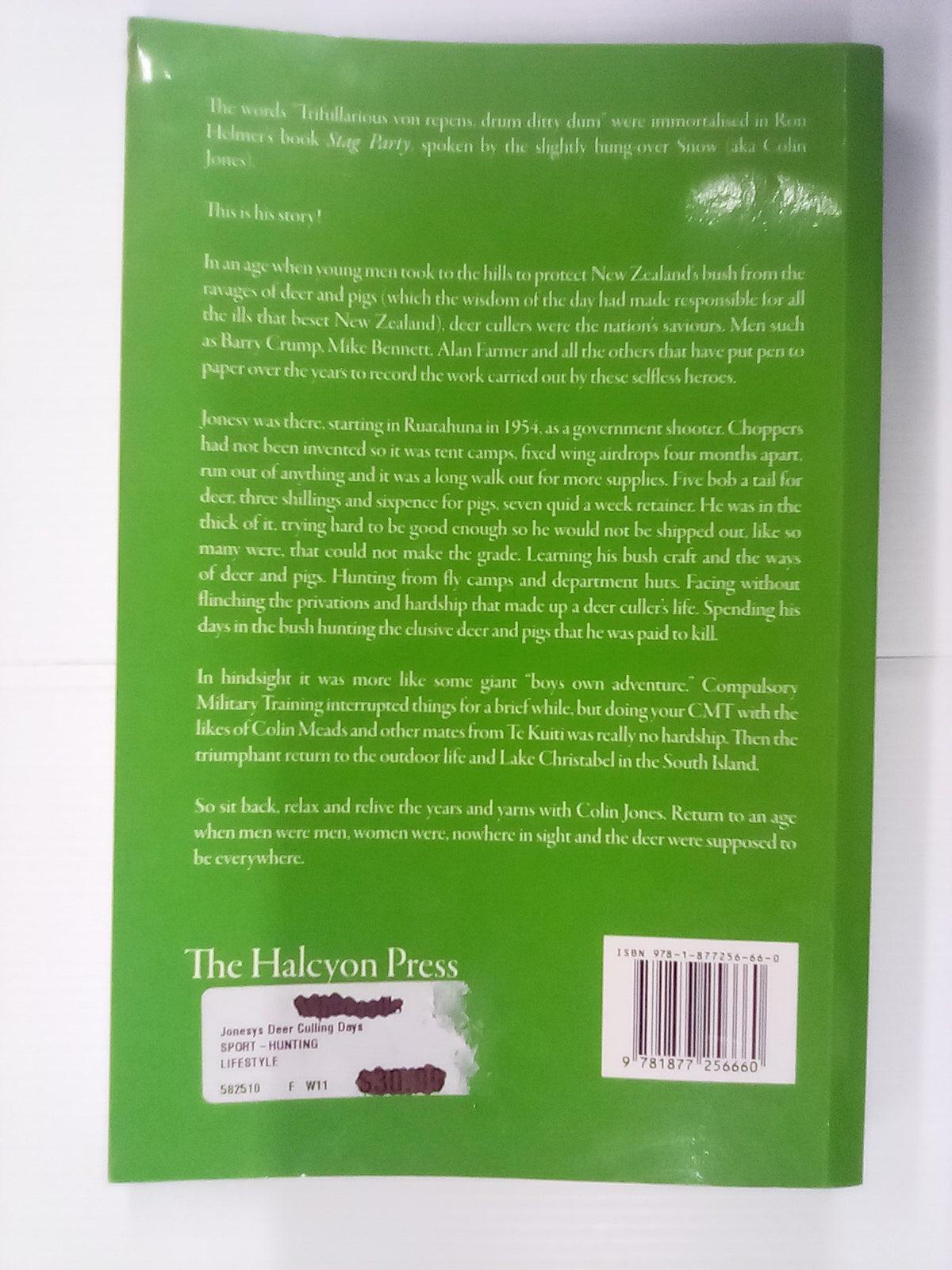 In an age when young men took to the hills to protect New Zealand's bush from the ravages of deer and pigs (which the wisdom of the day had made responsible for all the ills that beset New Zealand), deer cullers were the nation's Saviour's. Men such as Barry Crump, Mike Bennett, Alan Farmer and all the others that have put pen to paper over the years to record the work carried out by these selfless heroes. Jonesy was there, starting in Ruatahuna in 1954, as a government shooter. Choppers had not been invented so it was tent camps, fixed wing airdrops four months apart, run out of anything and it was a long walk out for more supplies. Four bob a tail for deer, three shillings and sixpence for pigs, seven quid a week retainer. He was in the thick of it, trying hard to be good enough so he would not be shipped out, like so many were, that could not make the grade. Learning his bush craft and the ways of deer and pigs. Hunting from fly camps and department huts. Facing without flinching the privations and hardship that made up a deer culler's life. Spending his days in the bush hunting the elusive deer and pigs that he was paid to kill.