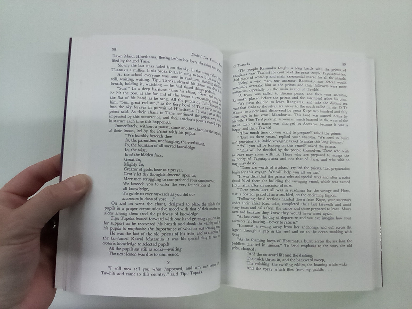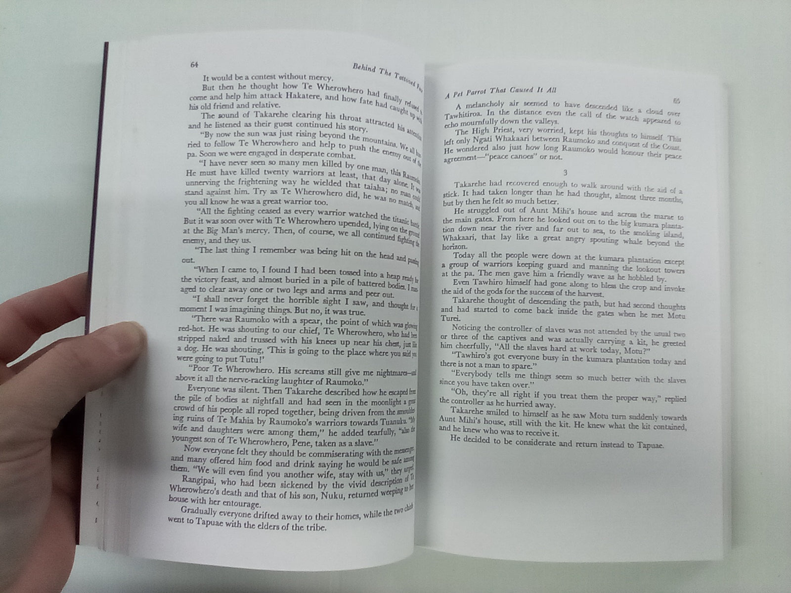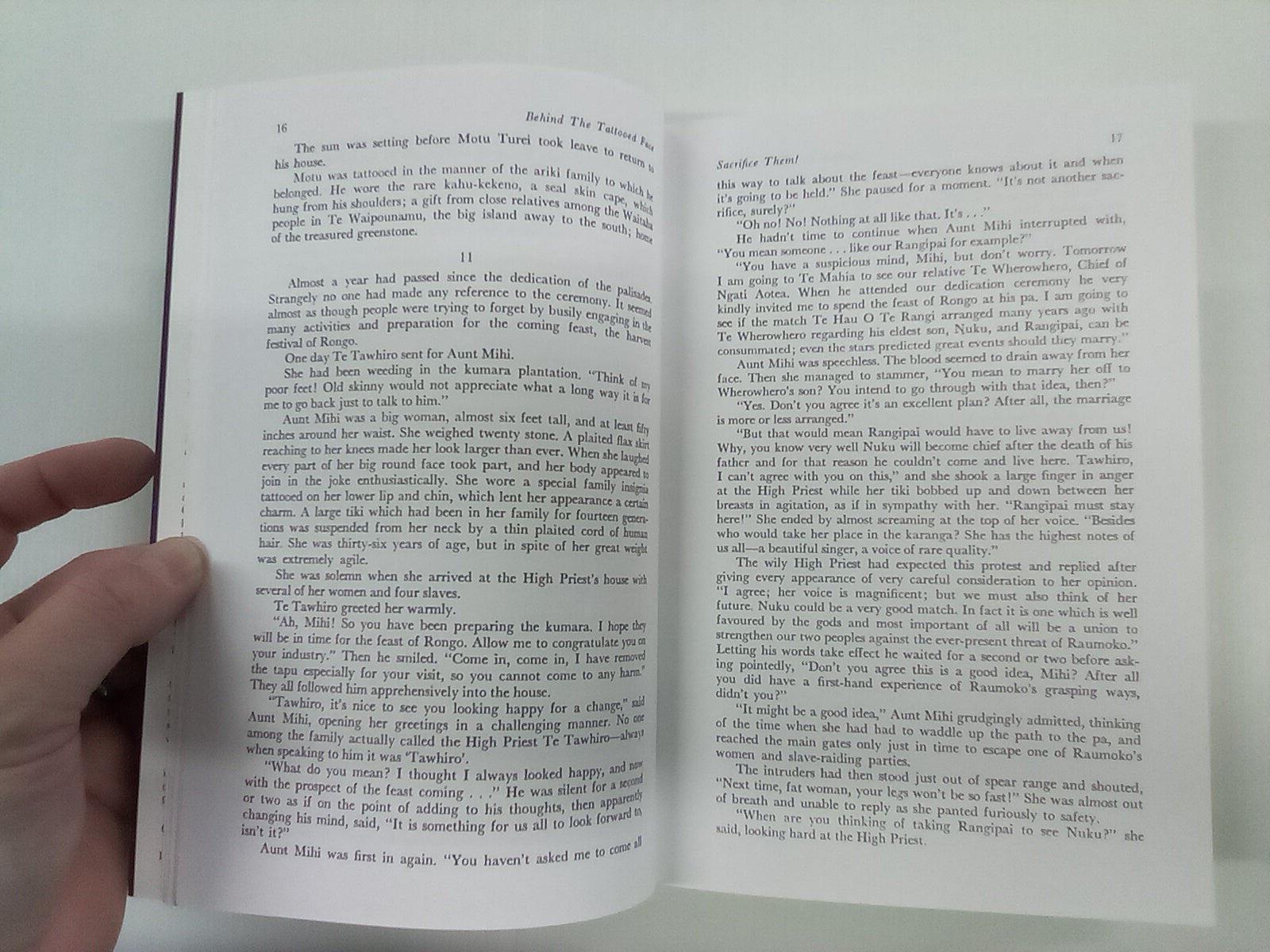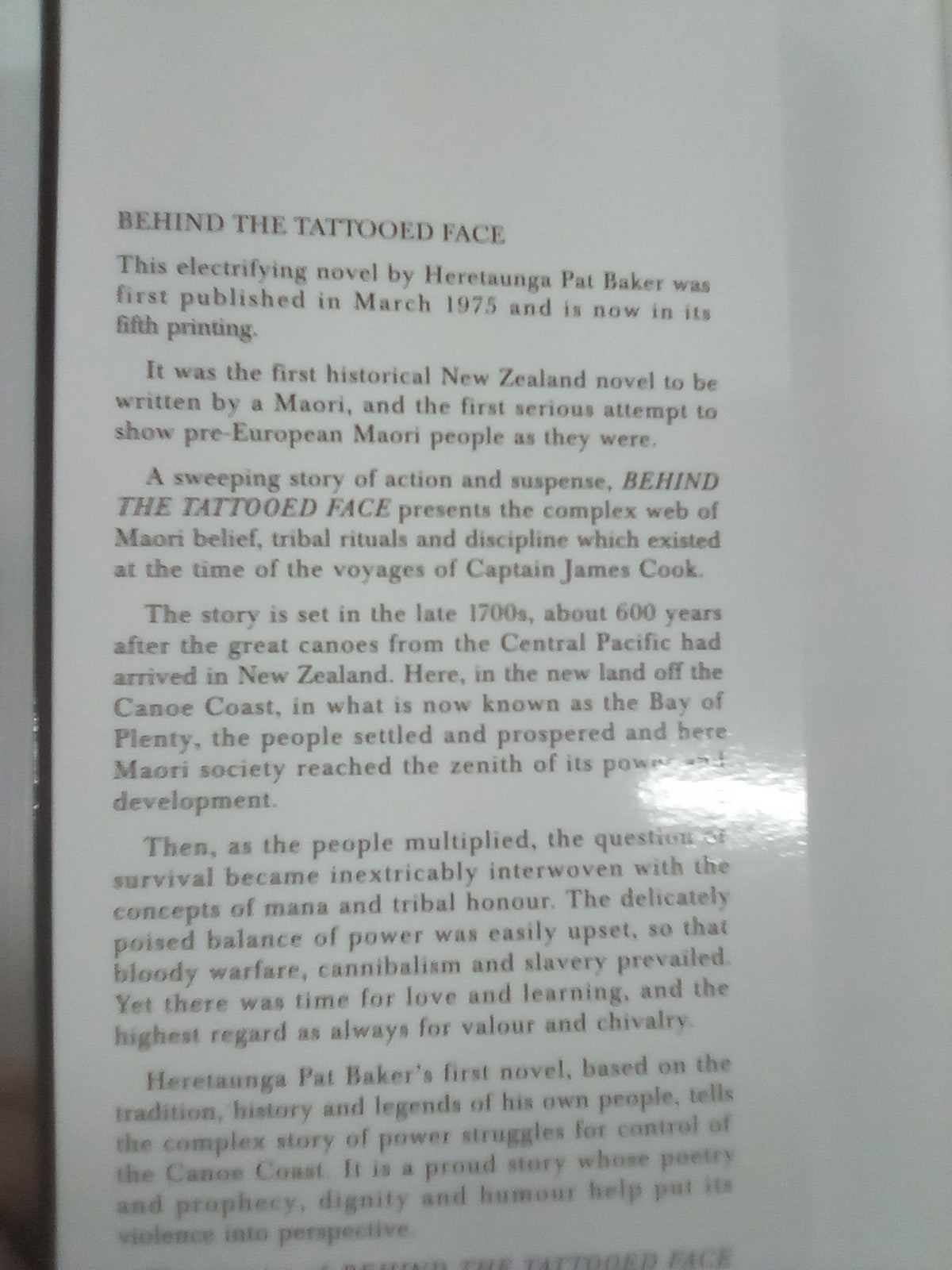 "A sweeping story of action and suspense, Behind the Tattooed Face presents the complex web of Māori belief, tribal rituals and discipline which existed at the time of the voyages of Captain James Cook. The story is set in the late 1700s, about 600 years after the great canoes from the Central Pacific had arrived in New Zealand. Here in the new land off the Canoe Coast, in what is now known as the Bay of Plenty, the people settled and prospered and here Māori society reached the zenith of its power and development. Then, as the people multiplied, the question of survival became inextricably interwoven with the concepts of mana and tribal honour. The delicately poised balance of power was easily upset so that bloody warfare, cannibalism and slavery prevailed."