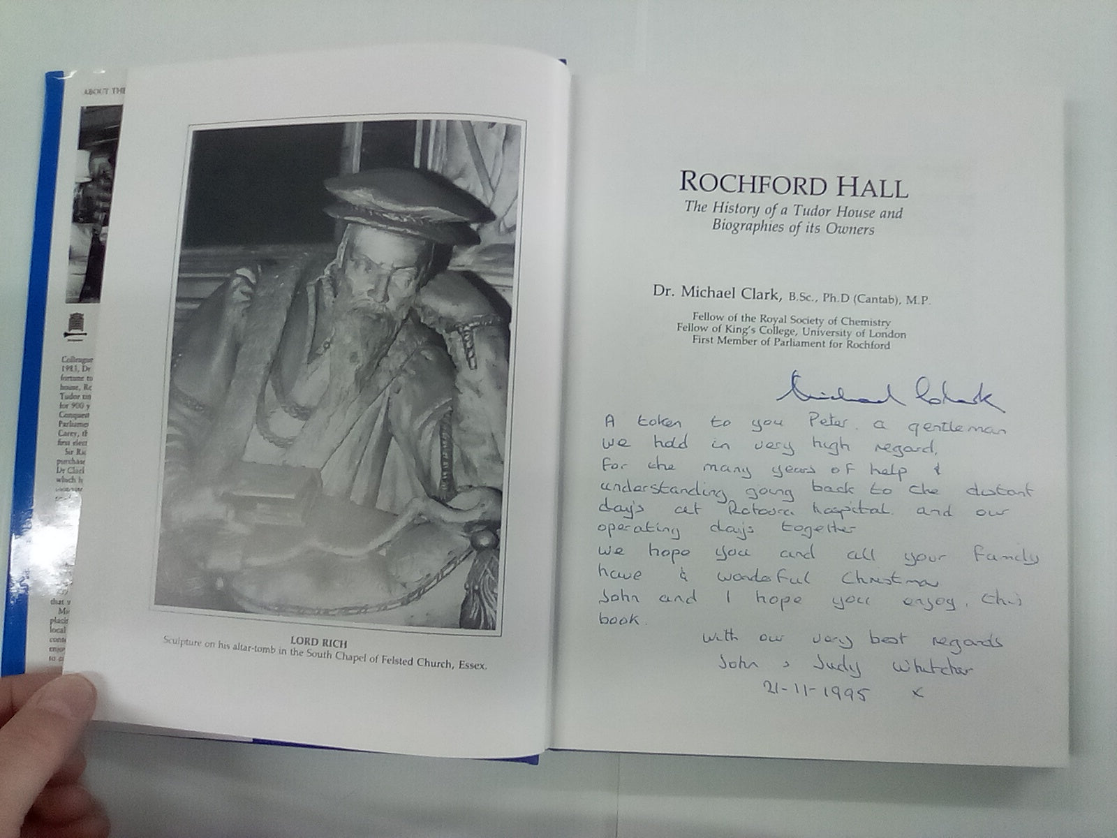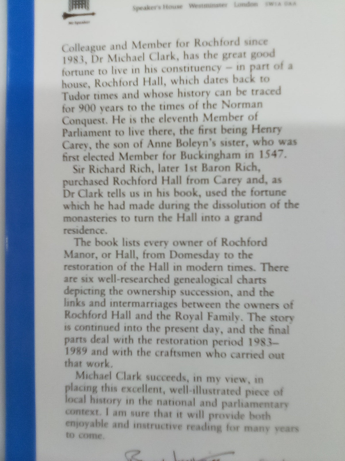 This is a second-hand copy of the book Rochford Hall - The History of a Tudor House & Biographies of the Owners by Michael Clark. This copy is signed by the author and number 758 of a limited edition.