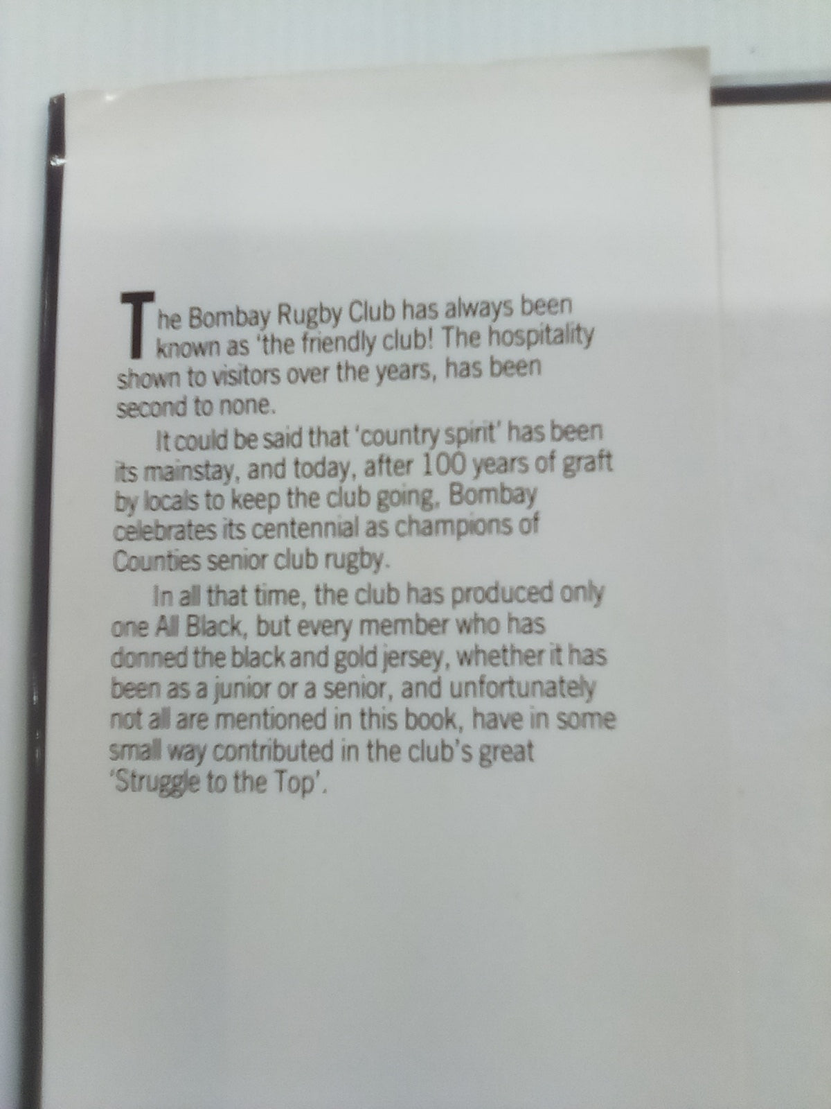 This is a second-hand copy of the book Struggle to the Top - 100 Years of Bombay Rugby 1888-1988 by Rex Warwood.